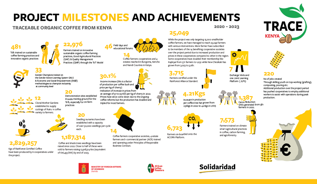 The project recently published a success story of one of the project beneficiaries and how transitioning to organic coffee has helped him enhance sustainability and resilience on his farm https://www.solidaridadnetwork.org/story/a-kenyan-coffee-grower-enhances-the-sustainability-and-resilience-of-his-farm/.
